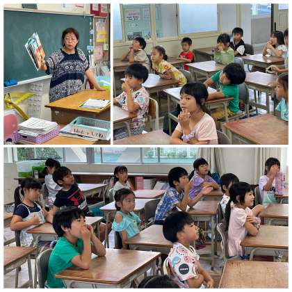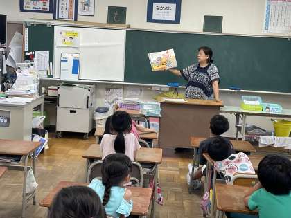7月10日(月) 【1-1国語】読み聞かせ 公開日 2023/07/10 更新日 2023/07/10 1年 1年1組の国語の授業のようすです。担任の先生が絵本の読み聞かせをしてくれていました。楽しいお話で笑顔が広がりましたね。