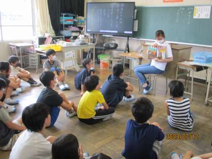 今日は子どもたちが楽しみにしていた7月の読み聞かせボランティアデーです。朝の時間を使って、読み聞かせボランティアさんがとっておきの本を紹介してくださいました。6年3組の活動のようすを紹介します。