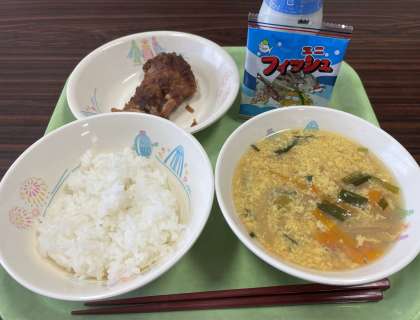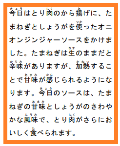 ごはん、ぎゅうにゅう、とりにくのオニオンジンジャーソースがけ、スーミータン、こざかな