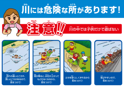 これから夏期をむかえるにあたり、川とふれあう機会が増えることが予想されます。安全に川とふれあうために、川の危険についてチラシで紹介されています。ご家族でご確認いただけるとうれしいです。