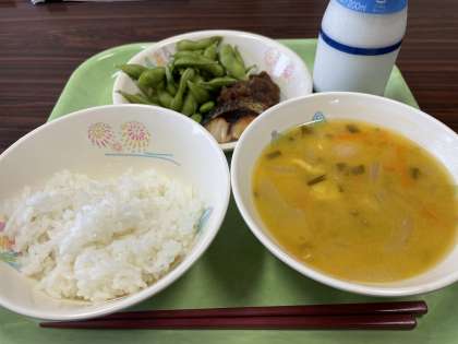 ごはん、ぎゅうにゅう、あじのうめおろしだれ、えだまめ、かぼちゃのみそしる