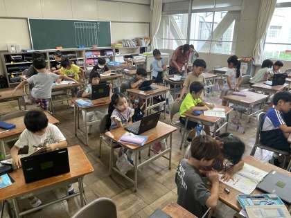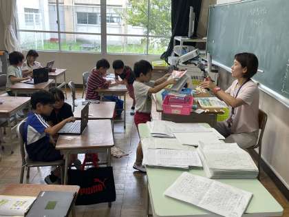 1年4組の算数の授業のようすです。教科書の問題やクロムブックのソフトの問題に挑戦して、1学期に学んだことを確認していました。たくさん問題を解くことができましたね。