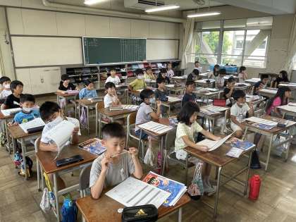 2年1組の学級の時間のようすです。担任の先生から夏休みの日誌やプリントをもらって、学習や生活について確認しました。教室の工事があるため、今年の夏休みの出校日は1日だけです。その日も教室には入れません。次に教室に入るのは2学期の始業式です。どんな教室になっているか、楽しみですね。