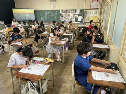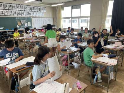 5年生の授業のようすです。1学期のしめくくりのテストや、夏休みの準備のプリント確認などを行っていました。また、クラスごとに稲のようすを見に田んぼに出かけました。とても大きくなっていて、生長がうれしかったですね。
