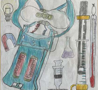 ノブッダくん作文より4年生の作品を紹介します。イラストの題は「理科の実けん道具」です。