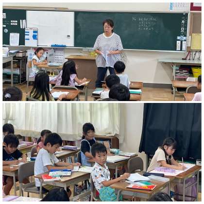 1年1組の授業のようすです。担任の先生から返却された「おむすびころりん」「かずしらべ」「ひきざん」「たしかめよう」のプリントをとじて、学習した内容を確認していました。自信をもって解くことができるようにしっかりと振り返ることができましたね。