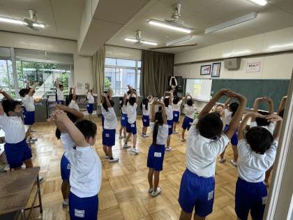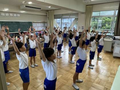 2年生の体育の授業のようすです。スポーツ大会のはじめに行う準備体操のビデオを見ながら体を動かしました。いろんな動きがありますが、楽しみながら表現できそうですね。気持ちのよい汗をかくことができたようです。
