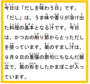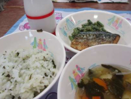 9月6日(水) 今日もおいしくいただきま〜す! 公開日 2023/09/06 更新日 2023/09/06 ひがしっ子ライフ わかめごはん、ぎゅうにゅう、さばのしおやき、いんげんのごまあえ、きくのすましじる