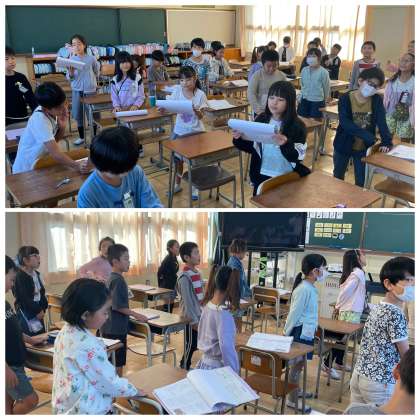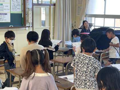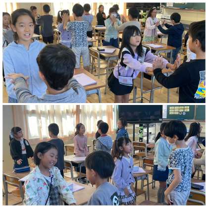 10月6日(金) 手あそびをつけて【3年生】 公開日 2023/10/06 更新日 2023/10/06 3年 3年生の音楽の授業のようすです。「手あそびをつけてたのしく歌おう」というめあてで「陽気なかじや」の曲を歌っていました。ペアの子と息を合わせて、手あそびをつけて歌うことができましたね。
