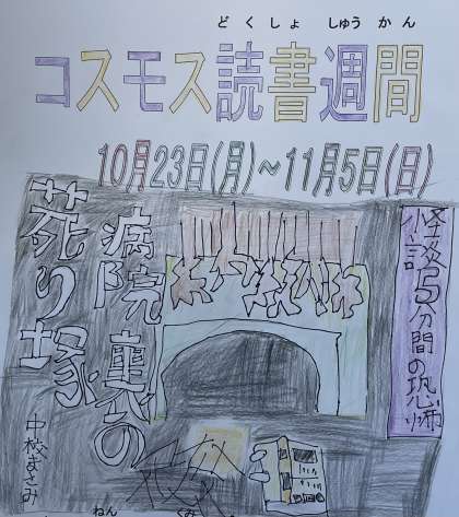11月4日(土) 4年 ウェブ展覧会【コスモス読書週間】 公開日 2023/11/04 更新日 2023/11/04 4年 10月23日から11月5日までコスモス読書週間です。たくさんの本との出会いを楽しみましょう!廊下には読書週間におすすめの本を紹介したポスターが掲示されています。4年生のポスターの一部を紹介します。