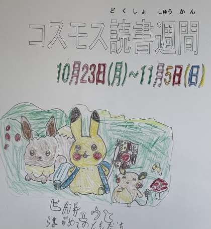 10月23日から11月5日までコスモス読書週間です。たくさんの本との出会いを楽しみましょう!廊下には読書週間におすすめの本を紹介したポスターが掲示されています。1年生のポスターの一部を紹介します。
