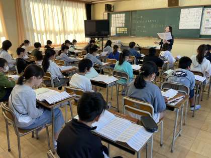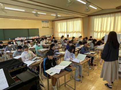 5年生の音楽の授業のようすです。先生が歌ってくれた音を聞きながら「風が吹いている」の曲の楽譜を追いました。曲が長くいろんな部分に飛びますが、しっかりと楽譜を追うことができましたね。5年生の歌声で聞けるのが楽しみです。