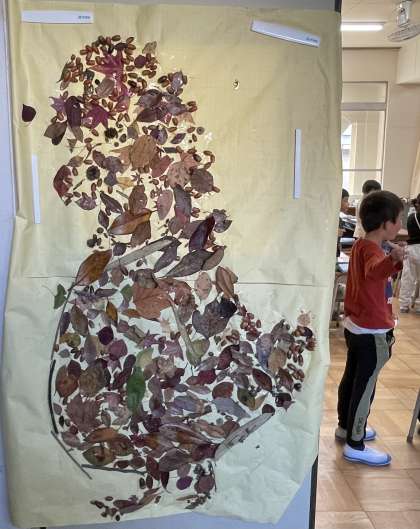 三連休のウェブ記事では、1年生が生活科で作った作品をウェブ展覧会で楽しんでいただけるように紹介しています。この写真の作品は、あるクラスで、子どもたちが作った作品で利用しなかった木の葉や木の実を集めてできた「大きな恐竜」です。子どもたちの体よりも大きい作品で、迫力がありますね。