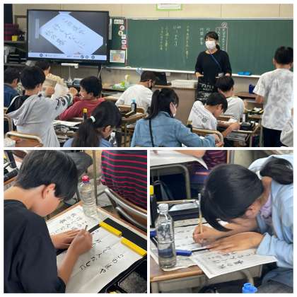6年2組の書写の授業のようすです。「文字の大きさやつながりを意識して小筆で書こう」というめあてで、「この道や 行く人なしに 秋の暮」という俳句を書きました。