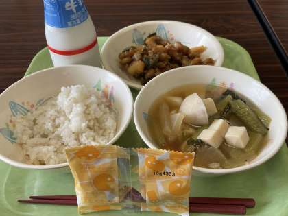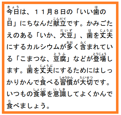 11月7日(火) 今日もおいしくいただきま〜す! 公開日 2023/11/07 更新日 2023/11/07 ひがしっ子ライフ ごはん、ぎゅうにゅう、いかとだいずのあまからいため、よしのじる、ミックスナッツ