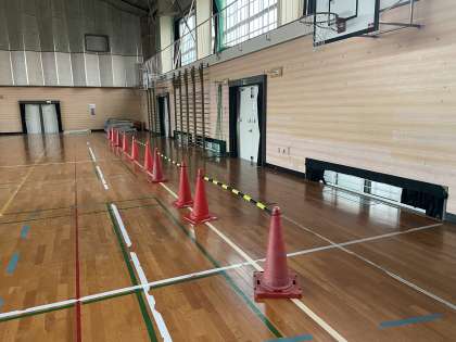 ひまわり組さんのスポーツ大会の会場は屋内運動場です。保護者の方は入り口付近のコーンの南側でご観覧ください。声援をよろしくお願いいたします。
