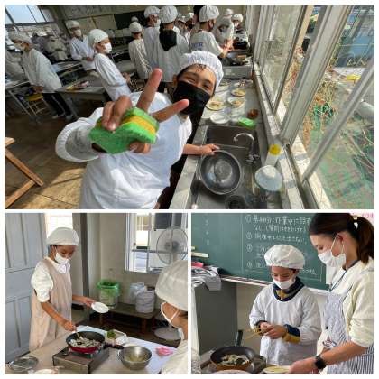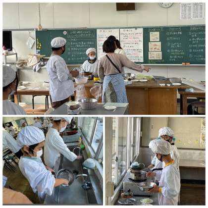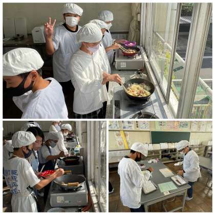 11月9日(木) 6-1 おいしい匂いに誘われて 公開日 2023/11/09 更新日 2023/11/09 6年 6年1組の家庭科の授業のようすです。おいしそうなにおいをたどっていくと、調理室に到着しました。「手順を確認しながら、おいしいベーコンポテトを作ろう」というめあてで調理実習に取り組んでいました。おうちでもぜひ家族に作ってあげてくださいね!