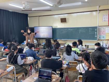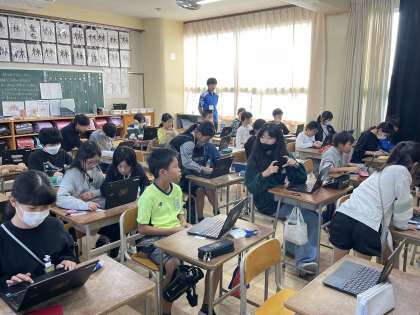 11月9日(木) 4年 英語クイズ 公開日 2023/11/09 更新日 2023/11/09 4年 4年生の外国語活動の授業のようすです。「クロムブックで英語クイズをしよう」というめあてで学習を進めていました。kahootを楽しむことができましたね。