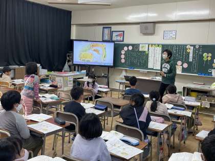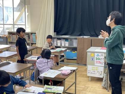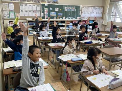 2年4組の国語の授業のようすです。物語の「お手紙」について「3場めんのがまくんとかえるくんの気もちを考え、音読をしよう」というめあてで学習を進めていました。