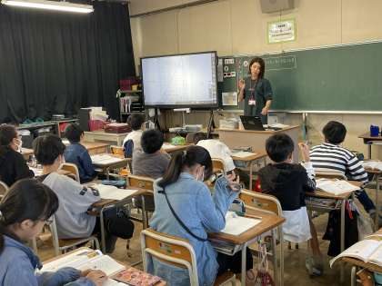6年2組の算数の授業のようすです。「比例のグラフからいろいろなことをよみとろう」というめあてで学習を進めていました。比例の特徴への理解を深めることができましたね。