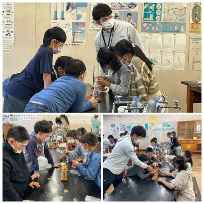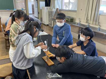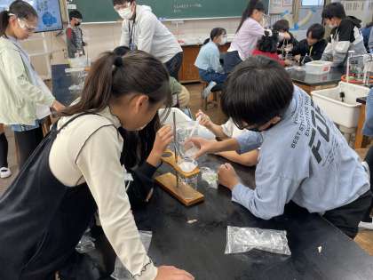 5年1組の理科の授業のようすです。食塩やミョウバンの水溶液を使って、液体をこして混ざっている固体を取り除く「ろ過」の実験に取り組んでいました。