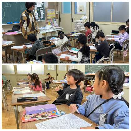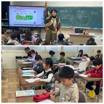 1年4組の算数の授業のようすです。「8+6のかみしばいをしよう」というめあてで学習を進めていました。絵を見ながら、たし算の場面のセリフを考えることを楽しめましたね。
