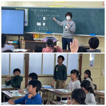 12月4日(月) 3-4 かけ算を暗算で! 公開日 2023/12/04 更新日 2023/12/04 3年 3年4組の算数の授業のようすです。「かけ算を暗算でしてみよう」というめあてで学習を進めていました。暗算でやるにはどのような手順で考えるとよいか、方法をみんなで確認しました。