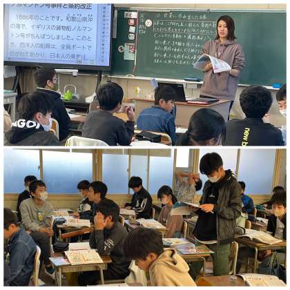 6年生の昨日の社会の授業のようすです。「日本は、江戸時代末に結んだ条約の影響により、どのような考えをもつようになったのかについて考えよう」というめあてで学習を進めていました。