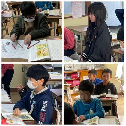 3年生の昨日の国語の授業のようすです。「お話のはじめと尾張でおじいさんがどのようにかわったのかを考えよう」というめあてで学習を進めていました。ワークシートにおじさんのようすをまとめて考えを深めました。