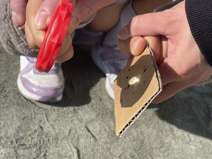 12月6日(水) 3-1 ひかりをあつめて 公開日 2023/12/06 更新日 2023/12/06 3年 3年1組の理科の授業のようすです。虫眼鏡を通して太陽の光を集めるとどうなるのか、ペアになって実験をしていました。小さな丸い光になるように虫眼鏡の位置を調整すると、煙が出てきましたね。何が起こっているのかわかったかな?