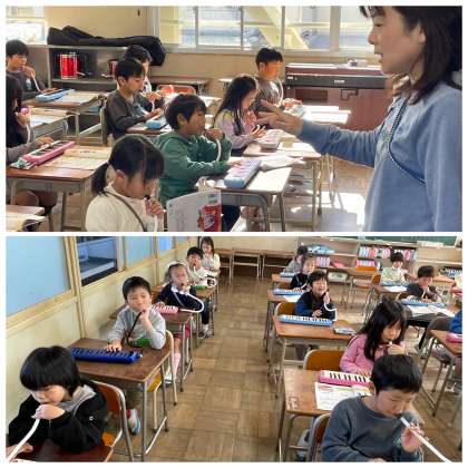 12月6日(水) 2-3 すずめがちゅん 公開日 2023/12/06 更新日 2023/12/06 2年 2年3組の音楽の授業のようすです。 ♪ドレミドソソソ レレレ レレレ♪ 「すずめがちゅん」をけん盤ハーモニカで演奏していました。みんなで息とリズムを合わせて、すてきな演奏ができましたね。