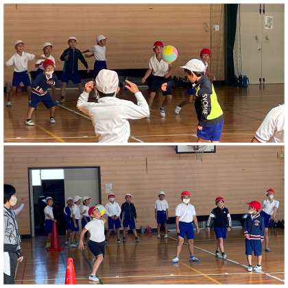 2年1組と4組の合同体育の授業のようすです。屋内運動場でドッジボールの対戦をしていました。みんなで声をかけ合いながらもりあげることができましたね。勝敗以上に、一生懸命がすてきでしたよ!