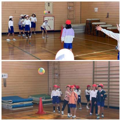2年1組と4組の合同体育の授業のようすです。屋内運動場でドッジボールの対戦をしていました。みんなで声をかけ合いながらもりあげることができましたね。勝敗以上に、一生懸命がすてきでしたよ!