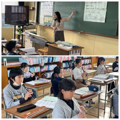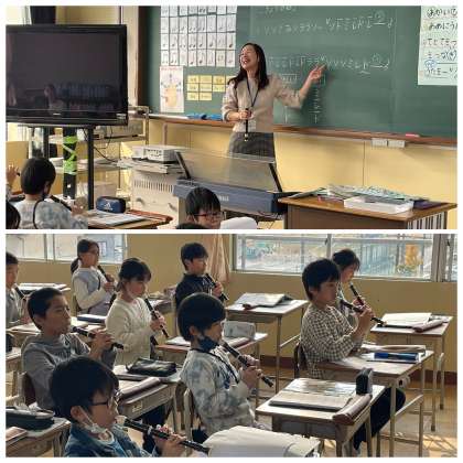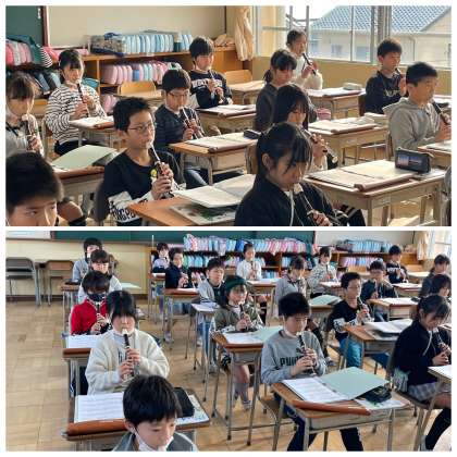 12月7日(木) 4年 こきょうの春 公開日 2023/12/07 更新日 2023/12/07 4年 4年生の音楽の授業のようすです。「気持ちを合わせて美しいひびきでえんそうしよう」というめあてで「こきょうの春」をリコーダーで演奏しました。息づかいや指づかいに気をつけて、美しい響きで演奏できましたね。