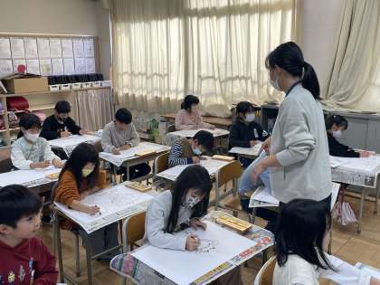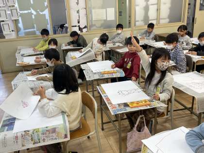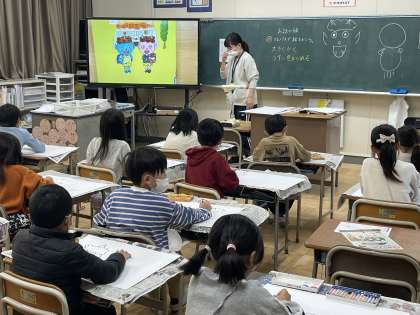 12月7日(木) 2-3 おはなしの絵をかこう 公開日 2023/12/07 更新日 2023/12/07 2年 2年3組の図工の授業のようすです。「クレパスで大きくかく」「うすい色からぬる」をめあてに、お話の絵を描いていました。どんな作品ができ上るか楽しみですね。