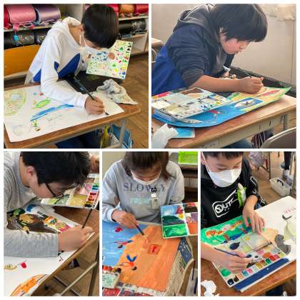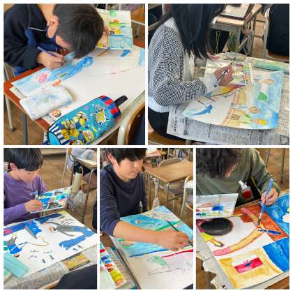 6年1組の図工の授業のようすです。読書感想画の完成が近づいてきましたね。鑑賞会が楽しみです。