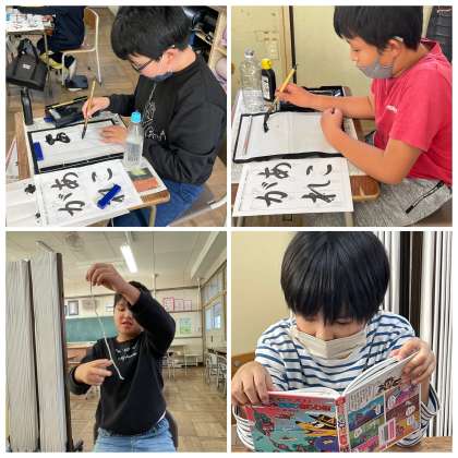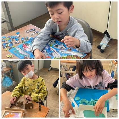 ひまわり組さんの今日のようすです。交流学級で習字に挑戦したり、パズルや読書をしたりして、今日も元気いっぱい過ごすことができましたね。