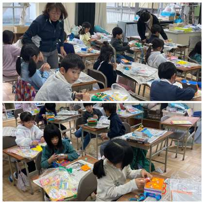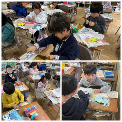 1年1組の図工の授業のようすです。すてきな箱作りに取り組んでいました。間もなく完成ですね。みんなで鑑賞し合うのが楽しみです。