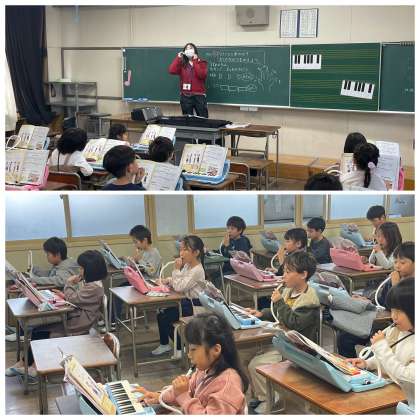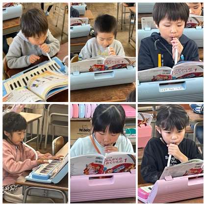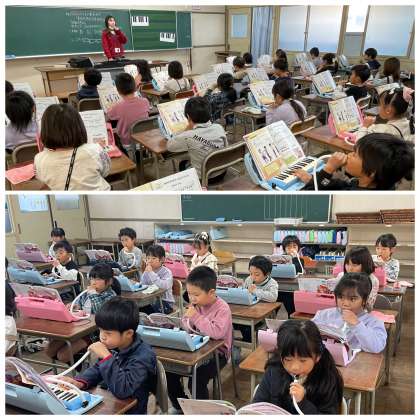 12月7日(木) 1-2 おとのながさをかんがえて 公開日 2023/12/07 更新日 2023/12/07 1年 1年2組の音楽の授業のようすです。すずめさんとぶたさんで、鳴き方が違うので、その違いをけん盤ハーモニカの演奏で表そうと工夫していました。