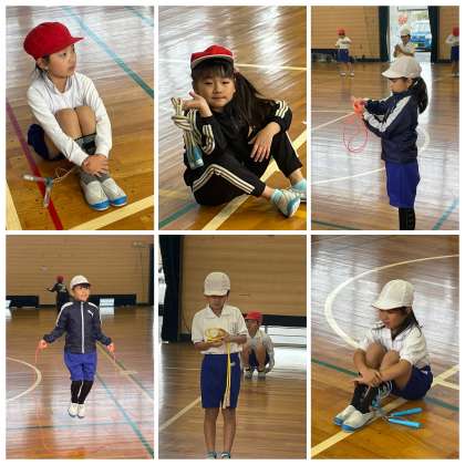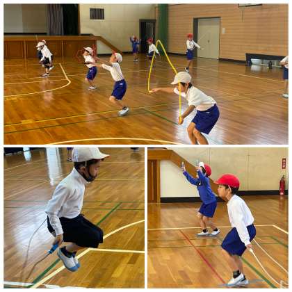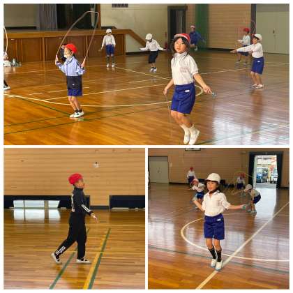 1年4組の体育の授業のようすです。なわとびにチャレンジする前に、なわとびを結んだり広げたりすることができるように練習しました。上手に準備や片付けができるようにがんばっていましたね。なわとびも楽しみながらとぶことができました!