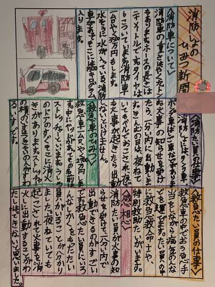 12月9日(土) 3年 ウェブ展覧会 公開日 2023/12/09 更新日 2023/12/09 3年 お休みの日を使って、ウェブ展覧会で3年生の社会のレポートの一部を紹介します。消防署に見学に行って学んだことをまとめたものです。
