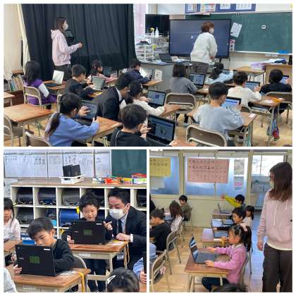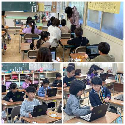 1年2組の学級の時間のようすです。担任の先生とICT支援員の先生にクロムブックのソフトを使ってクリスマスカードを作る方法を教えてもらいました。写真やかわいいイラストをつけて、すてきなカードができましたね。