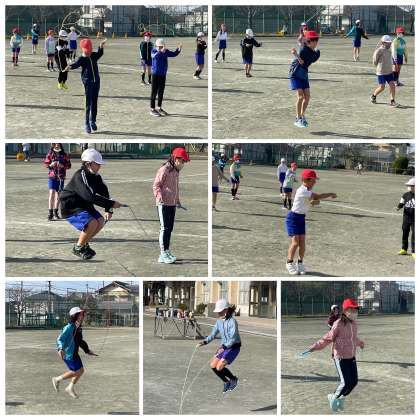 4年1組の体育の授業のようすです。なわとびを使った運動に取り組んでいました。一人でいろんな種目を練習した後、2人とびや、おおなわとびにもチャレンジしました。気持ちよく体を動かすことができましたね。