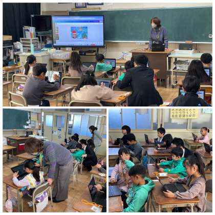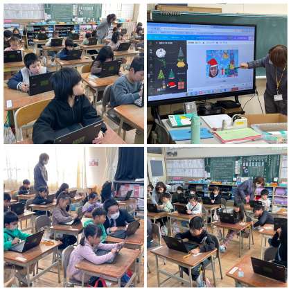 1年3組の学級の時間のようすです。担任の先生とICT支援員の先生にクロムブックのソフトを使ってクリスマスカードを作る方法を教えてもらいました。写真やかわいいイラストをつけて、すてきなカードができましたね。