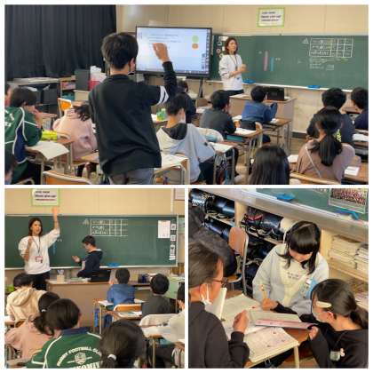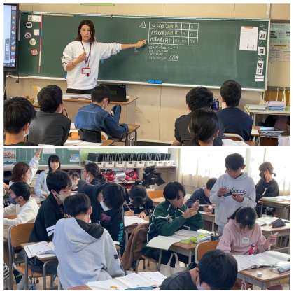 6年2組の算数の授業のようすです。「なしとかきはそれぞれいくつだろう」という2つのわからない数量をもとめる方法を考えていました。表や式にして、どうして求められるのか説明して理解を深めていきました。
