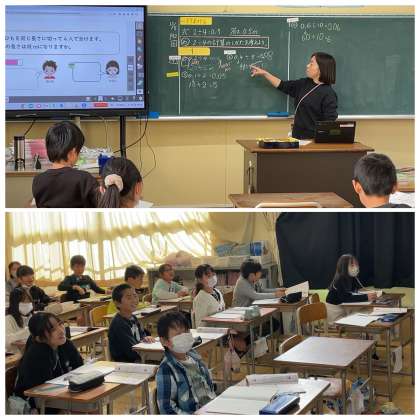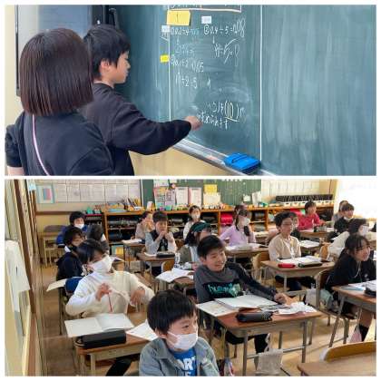 4年4組の算数の授業のようすです。「2÷4の計算のしかたを考えよう」というめあてで学習を進めていました。答えの位に気をつけながら、計算を考えることができましたね。