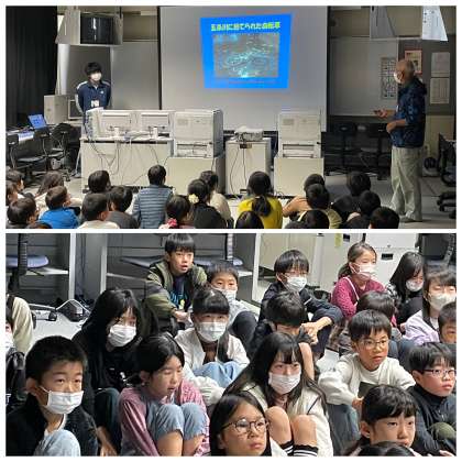 今日の2時間目に4年1組さんと2組さんはパソコン室に集まって、じっちゃん先生こと川口邦彦さんからお話を聞く、地球環境学習を行いました。