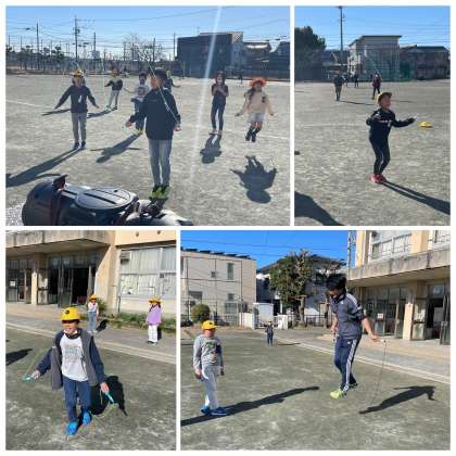 午前の長放課のようすです。冷たい風が吹いていましたが、今日も元気に体を動かすことができました。なわとびチャレンジをする子がたくさん昇降口の前に集まっていましたね。4年2組の先生は三十跳びを見せてくれましたよ。みんなもぜひ挑戦してみよう!