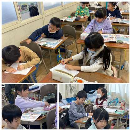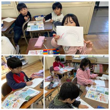 12月14日(木) 1-1 のってみたいな いきたいな 公開日 2023/12/14 更新日 2023/12/14 1年 1年1組の図工の授業のようすです。「どんな車にのって、どんなせかいにいきたいかな」というテーマでイメージ図を描きました。