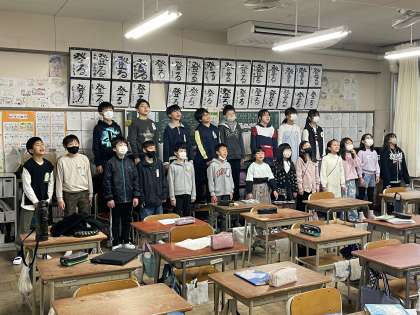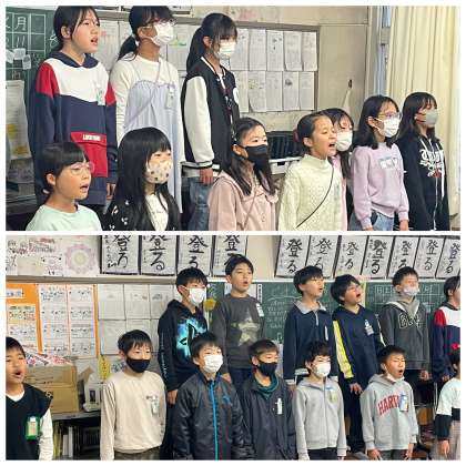 12月15日(金) 5年 金の朝はハーモニータイム! 公開日 2023/12/15 更新日 2023/12/15 5年 5年生の朝の活動のようすです。歌い出しからすばらしい声量に驚かされました。さすが5年生ですね。担任の先生に指揮に合わせて曲想豊かに表現できましたね。